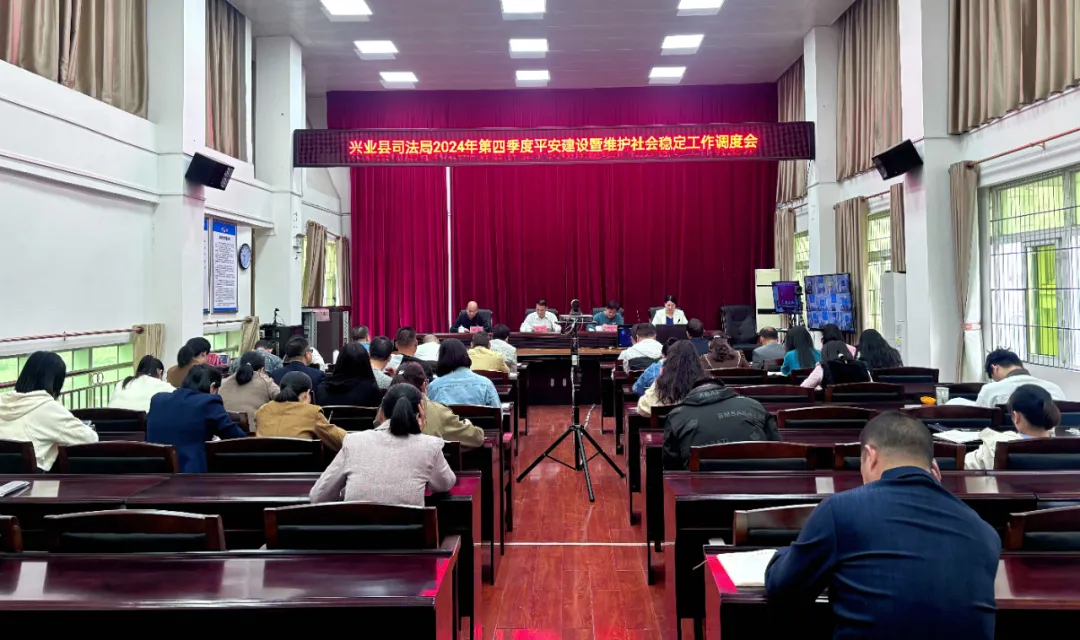 为进一步分析当前社会稳定、矛盾纠纷排查化解、重点人群管控等工作面临形势,安排和部署第四季度维稳各项工作,11月25日,玉林市兴业县司法局召开了2024年第四季度平安建设暨维护社会稳定工作调度会,局领导班子、各股室、司法所、社区戒毒康复中心全体人员参加了会议。局党组书记、局长李宁主持会议并讲话。