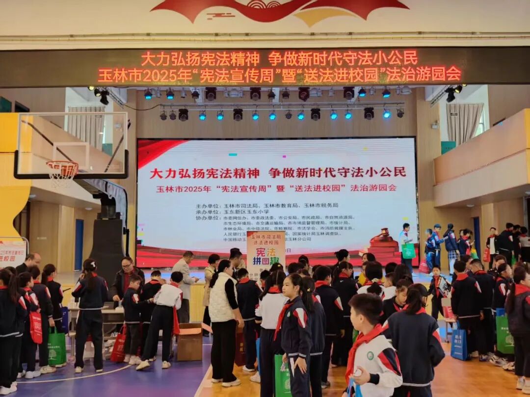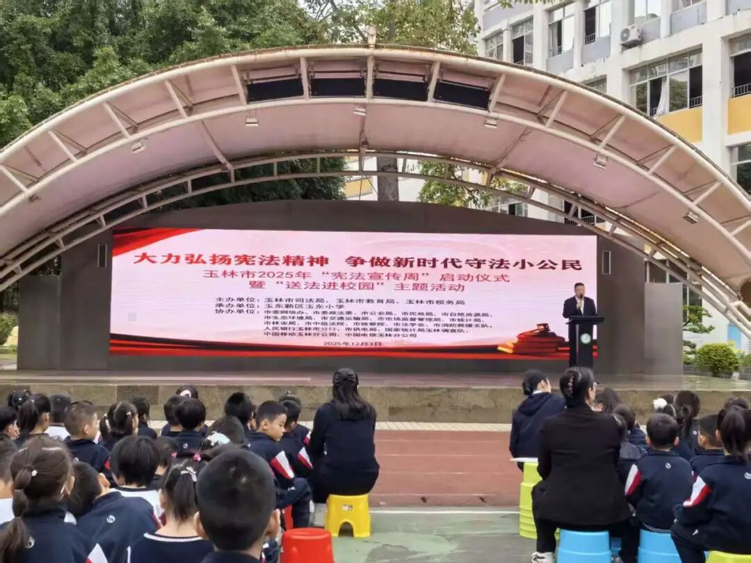 为深入学习贯彻习近平法治思想,弘扬宪法精神,12月3日上午,玉林市2025年“宪法宣传周”启动仪式暨“送法进校园”主题活动在玉东小学举办。本次活动由玉林市司法局、市教育局、市税务局联合主办,玉东小学承办,市委网信办、市公安局、市中级法院等20余家单位协办,汇聚多方力量共同为青少年打造沉浸式法治学习体验。活动以习近平新时代中国特色社会主义思想为指导,紧扣小学生认知特点和成长需求,通过庄严仪式、文艺展演与趣味互动相结合的创新形式,让宪法精神走进校园、融入童心,构建“尊法、学法、守法、用法”的良好校园氛围。