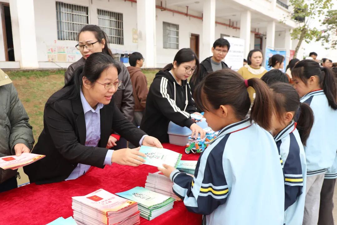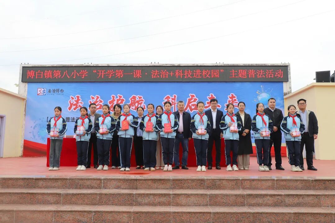 在赠书仪式上,主席台领导们向博白镇第八小学的学生代表赠送了《中华人民共和国民法典》等法治宣传书籍。一本本崭新的书籍传递到孩子们手中,不仅传递了知识,更寄托了长辈们对青少年“学法、懂法、守法、用法”的殷切期望。接过书籍的同学们纷纷表示,要努力学习法律知识,做法律的忠实崇尚者和坚定捍卫者。