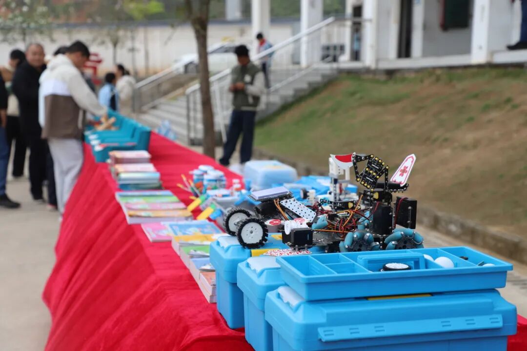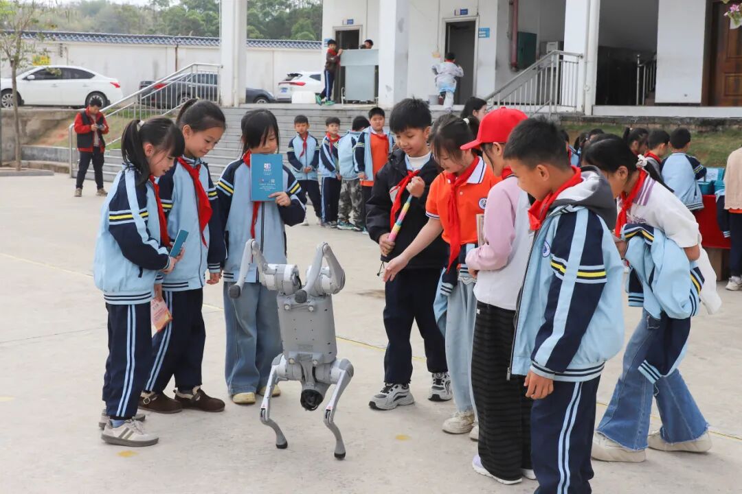 操场上,满载科学仪器的“科普大篷车”变成了流动科技馆,同学们围在各类展品前,亲手操作,探索声、光、电的奥秘。最受欢迎的当属机器狗互动体验,随着机器狗做出作揖、翻跟头等各种灵活可爱的动作,同学们的欢呼声此起彼伏。与此同时,志愿者们还向在场学生发放了法治、科普宣传手册,让科学的种子在校园里生根发芽。